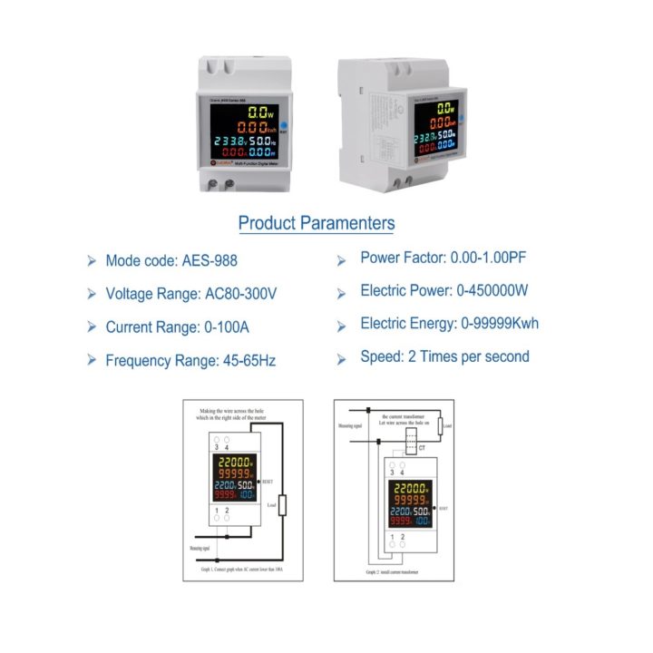 - 6 in 1 multifunctional electricity meter, including voltage: 80-300V, current: 0-100A, electrical power: 0-450000W, energy: 0-99999kWh, frequency: 45-65Hz and power factors: 0-1PF.