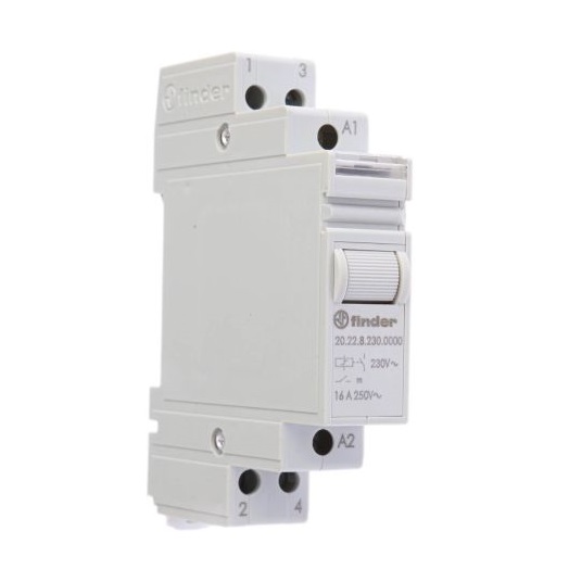 - Finder step relay is an AC powered double phase modular latching device with two NO contacts and switching current 16A.